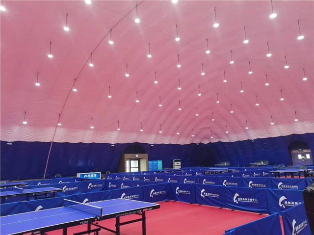 不仅如此,此结构还具有节约能源、减少水资源消耗、降低二氧化碳排放量、延长使用寿命、可持续性等功能。据介绍,气膜结构乒乓球训练场还有多方面的优势,一是采用的是轻质材料,比传统建筑更容易维持温度和空气流通,从而减少能源消耗;二是其天花板上设有排水系统,雨水可以被收集再利用,从而减少了水资源的浪费;三是建造需要的材料比传统建筑要少,因此其制造过程中产生的二氧化碳排放量也相应减少;四是不受自然灾害如地震、龙卷风等影响,并且不会出现裂缝或漏水问题等,因此拥有更长的使用寿命;五是搭建时间较短,同时可以拆卸和移动,因此具有更高的可持续性,可以在需要时随时重新配置或转移使用。